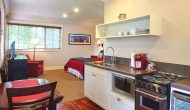 Sleeps 2 Guests. Set up like a Modern Studio Apartment (Great for extended stays!) with Queen bed, Dining Area, Kitchen (all kitchenware included). Bathroom with glass shower. Wi-Fi, Cable TV, Microwave, Mini-Fridge, Keurig, free parking. Discounted rate available on stays of five nights or more. Please note: this room is located in a building adjacent to the Historic Hotel.